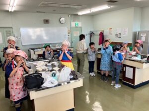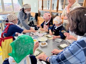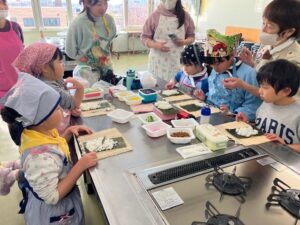 ゲーム終了後、公民館の調理室に戻って「恵方巻作り」。7種類の具を好きなだけ詰めて、自分だけの恵方巻を作りました。