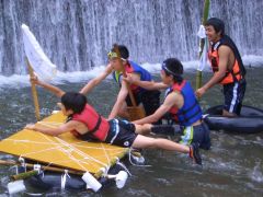 手作りいかだに乗って、旗取り競争を行いました。