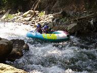 <2日目> 朝礼、ゴムボートでの渓流下り、野外料理(窯焼きピザ)、テント撤営、肝試し